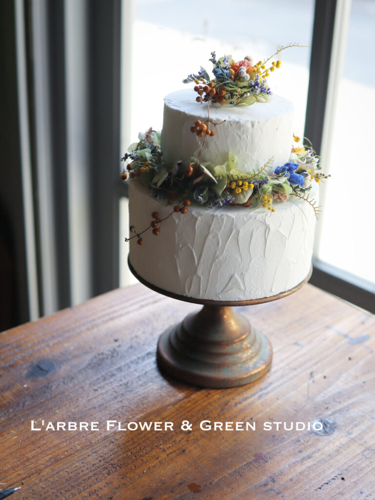 下段と上段の境目には細めのリースを作って飾り、上段はワイヤリングした花材を挿して飾ります。どちらも季節ごとに着せ替えが出来るデザインです。春夏秋冬で雰囲気を変えながら、長くお楽しみいただけます。お誕生日やウエディングなど、特別な日の贈り物や飾りにもピッタリです。 写真は一例となります。