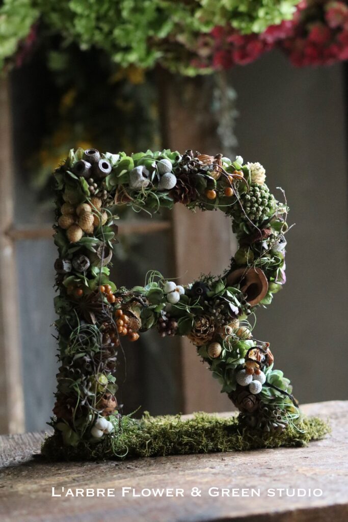 たくさんの花材の中から選び作っていただきます。こちらはグルーで作るリースとなります。 5日前までにご希望のイニシャルとリース(壁掛け)またはオブジェ(自立式)をお教え願います。